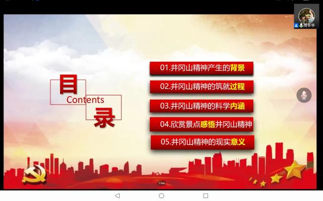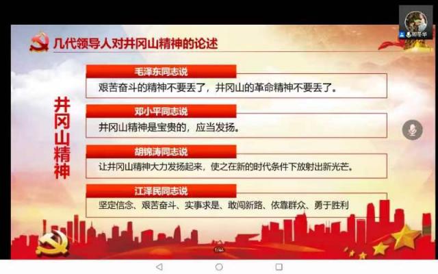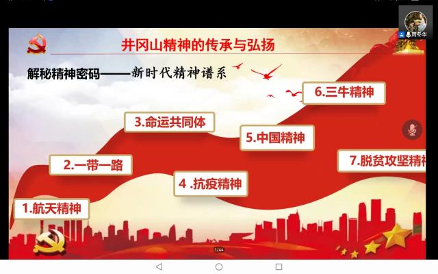 5月15日晚,会计学院开展以“井冈山精神铸魂育人”为主题的党课培训第六讲。本次课程主讲人为会计学院院长周冬华,党校全体学员以线上方式参与党课。本次课程围绕“井冈山精神铸魂育人”主题,分别从“产生背景”、“筑就过程”、“科学内涵”、“现实意义”五个角度来介绍伟大的井冈山精神。