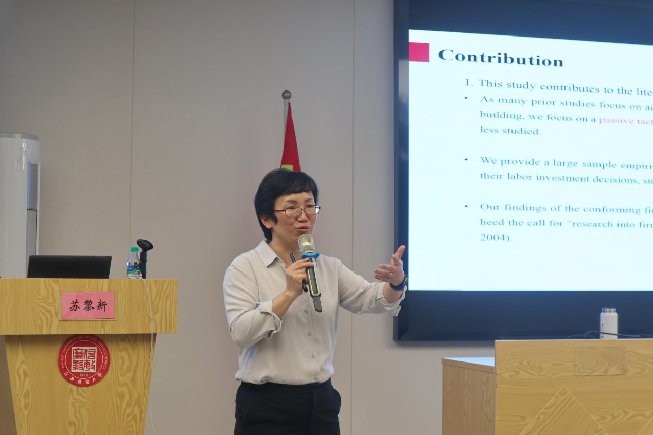 接着,苏黎新教授深入剖析了论文的行文思路,介绍了论文的研究假设并详细阐述实证分析的过程,包括变量处理、研究模型、结果分析解释等。她指出地方政府就业目标会促使企业增加劳动力投入以满足政治期望,且这一效应在市长任期即将结束时更为显著。同时,当企业试图达到地方政府设定的就业目标时,其劳动生产效率会降低,且在经济衰退期间,那些达到政府就业预期的企业业绩恶化更为严重。