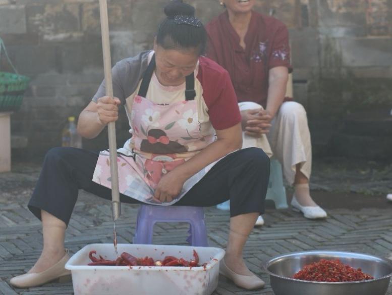 在村民院前,几位村民正围坐在古树下制作当地特色美食——辣椒饼,手法娴熟地将新鲜红辣椒剁碎。“这辣椒饼是咱村的老手艺了,家家户户都会做。”村民介绍道。制作辣椒饼的手艺在旸田村已传承数代,空气中弥漫的辣椒香气成为村里独特的味道。队员们记录着制作过程,不时向村民请教技巧,感受着传统手艺中蕴含的生活智慧与乡土情怀。
