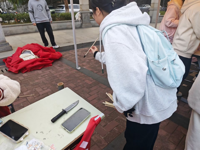 在投壶游戏的环节中,主持人详细讲解了投壶的历史渊源与基本规则,引导参与者立于指定线后,调整站姿、凝神聚力,目光专注地瞄准壶口。每当竹矢精准入壶,参与者便会忍不住欢呼喝彩,脸上洋溢着喜悦与自豪;即便未能投中,同学们也毫不气馁,纷纷交流投壶技巧、调整投掷姿势,摩拳擦掌、跃跃欲试,期待下一次挑战能够突破自我。同学们沉浸式走进古人的娱乐世界,在亲手投掷、互动比拼的过程中,不仅放松了身心,更直观感受了投壶这一传统民俗的独特魅力。
