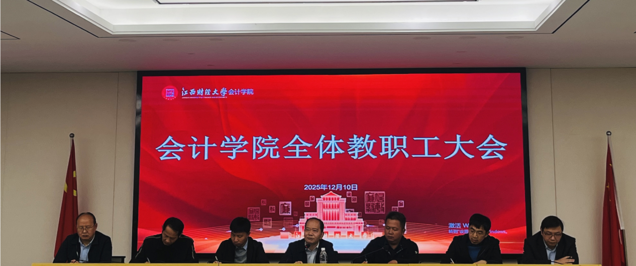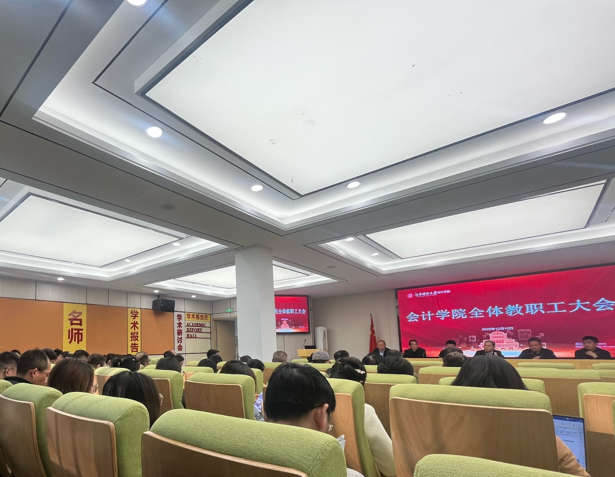 纪律和政治规矩,引导全体教职工筑牢思想根基、端正行为作风。要注重弘扬团结奋进的正能量,涵养积极健康的学院政治生态,为各项事业持续健康发展提供坚强保障。二是要持续奋发有为,力求务实创新,全面推动学院高质量发展。要对标学校“双一流”建设目标,优化学科布局,重点发展智能会计、数字审计、AI+等前沿方向。坚持差异化竞争,进一步做好社会化服务工作。会计学院要牢牢坚守学科主阵地,将会计学科建设作为学院发展的核心引擎,持续巩固特色、铸牢优势。同时,加大人才引进力度,着力集聚学科领军人才与团队,持续强化学科特色与优势。三是要营造和谐氛围,强化队伍建设,打造高素质专业化团队。要扎实推进有组织的人才队伍建设,系统抓好教研队伍、党团工学队伍、后勤教辅队伍三支力量。全院上下要通过“三会一课”等多种形式创造性开展工作,持续提升队伍的凝聚力、战斗力,提升学院治理能力与治理水平,打造高素质专业化师资团队。