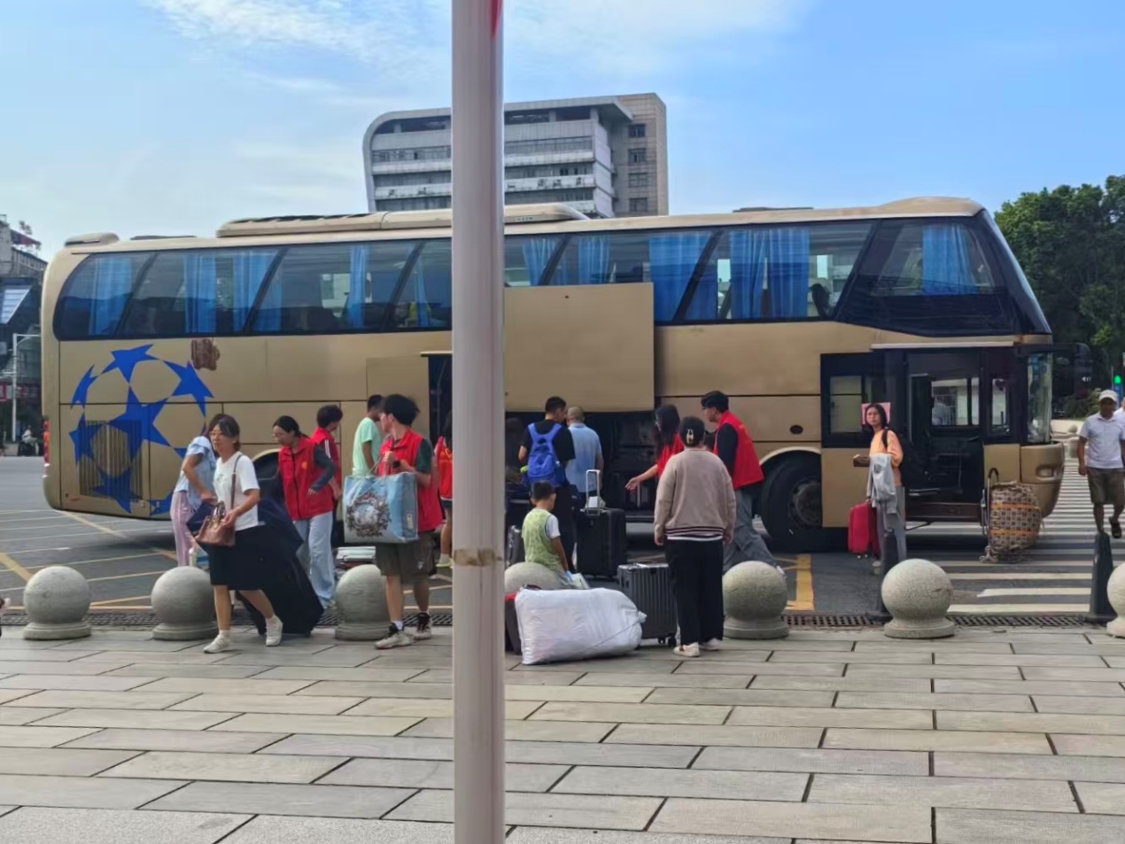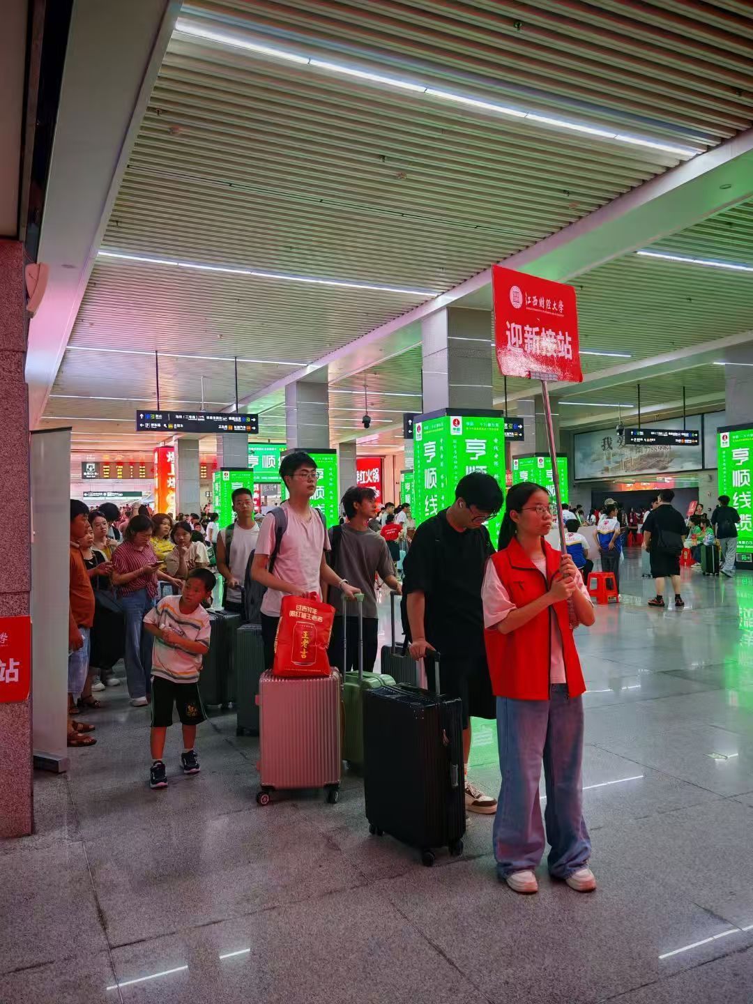 在火车站迎新服务点,志愿者们严格做好考勤工作,穿着志愿者服,携带接站牌、横幅等迎新物资驻守岗位。他们细致询问到站新生入学信息,主动接过沉重行李,引导新生有序乘坐大巴,全程护送至学校指定地点。即便车站人流繁杂,志愿者们始终耐心周到,以暖心服务缓解新生初到陌生环境的局促,让其入学之初便感受到家的温馨。