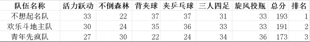 经多轮比拼,各项目成绩揭晓。“不想起名队”排名第一,“欢乐斗地主队”排名第二,“青年先疯队”排名第三。