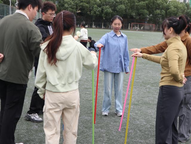 “不倒森林”项目聚焦团队的专注与同步能力。队员们围成圆圈、面向圆心,仅用右手掌心压住PVC管保持竖立,集体顺时针或逆时针移动,以连续移动次数排名,次数越多则成绩越优。“夹乒乓球接力”则是耐心与技巧的比拼,每队6人排队用筷子从10米外的箱子夹球运回,在此过程中队员严守规则、屏气凝神,终点时刻欢呼声此起彼伏。