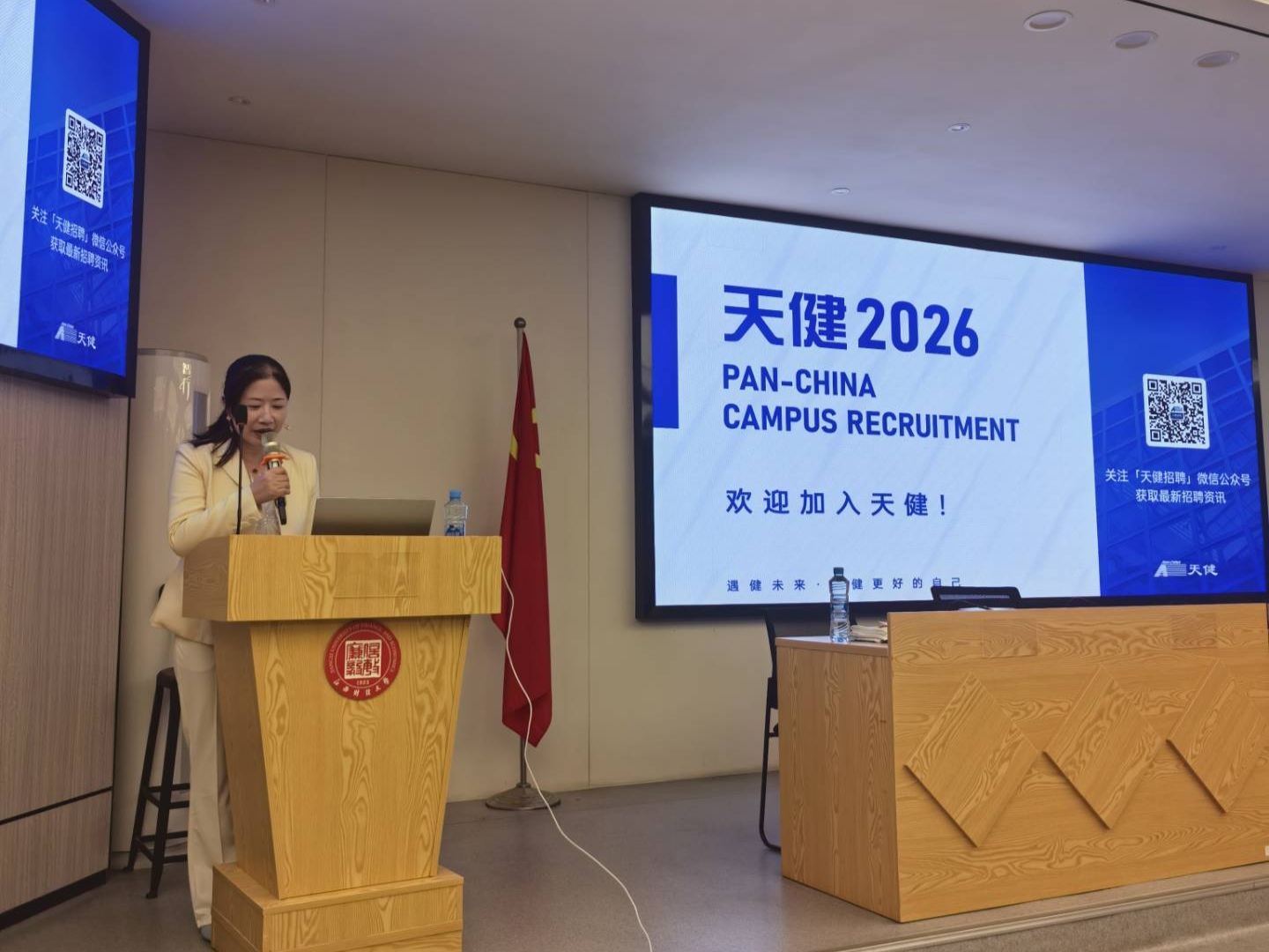 最后,江娟明确2026届要求:本科生需过特控线、英语四级,研究生无此限制;岗位涵盖财务审计、金融咨询等业务类及行政、人力等职能类。互动环节中,针对“考研vs入职”“招聘倾向”等问题,江娟表示:实践与学历同样重要,天健更看重“上进好学、主动吃苦”的候选人。现场同学积极提问,获天健定制周边礼品。