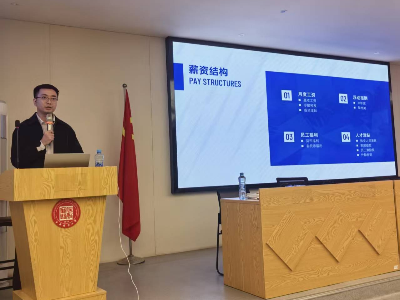 宣讲会伊始,富金威介绍了员工培训与晋升体系:审计岗本科生入职定级为审计员,研究生可定高级审计员一;通过注会考试、满足工作年限即可晋升,最快12-13年可成为合伙人,体系透明且公平。薪酬方面,包含月度工资、浮动报酬及多元福利,杭州总所应届生首年平均报酬约13万元,取得注会证书后收入增幅显著。