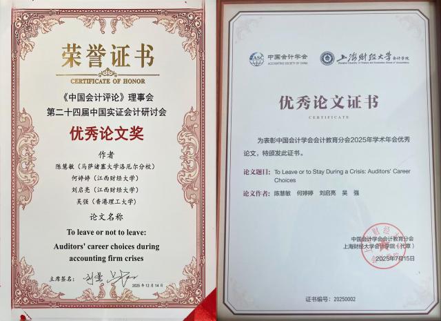 刘启亮教授与何婷婷博士参与合作的论文中,《To leave or not to leave: Auditors' career choices during accounting firmcrises》一文在《中国会计评论》理事会主办的第二十四届中国实证会计研讨会中荣获优秀论文奖;《Auditors' Strategic Career Choices: Evidence from the Wuyang Bond Case inChina》一文在中国审计学会审计教育分会2024学术研讨会优秀论文评选中荣获优秀论文二等奖;《To Leave or to Stay During a Crisis: Auditors' CareerChoices》一文在中国会计学会会计教育分会2025年学术年会上获评优秀论文;《政府采购与企业成本独特性》一文在中国会计学会管理会计专业委员会2025年学术年会中荣获优秀论文三等奖。此外,刘启亮教授参与合作的《由谁复核重要吗?——来自信贷市场的经验证据》在第十四届审计理论创新发展论坛暨CCGAR2025年学术会议中荣获优秀论文奖。