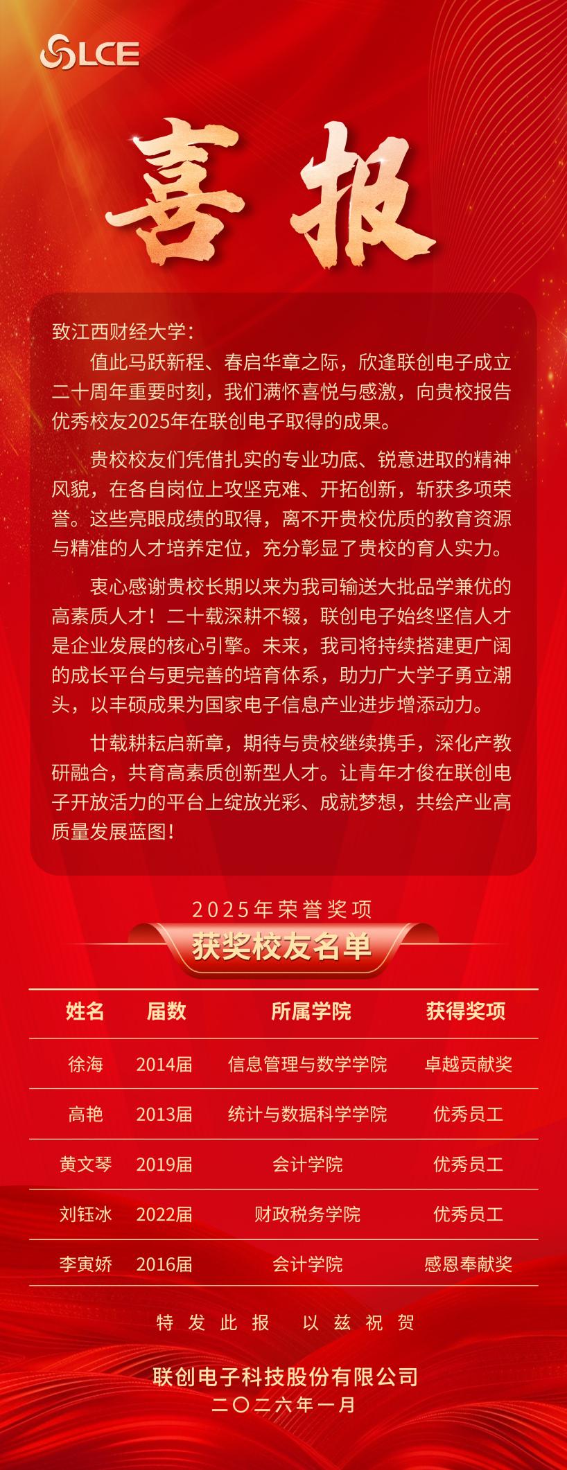 近日,联创电子科技股份有限公司在成立二十周年之际,向江西财经大学发来贺信,称赞我校校友在企业发展中作出的突出贡献,感谢学校长期以来为其输送大批高素质人才。贺信中提及,我校多位校友凭借扎实的专业功底和锐意进取的精神,在联创电子斩获卓越贡献奖、优秀员工、感恩奉献奖等多项荣誉,其中涵盖会计、信息管理、统计、财政税务等多个学科领域,充分彰显了我校人才培养的高质量与针对性。