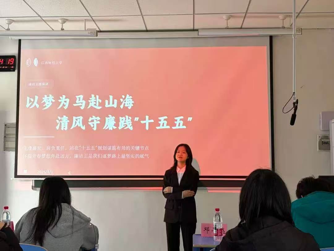 为引导学生深化对校训“信敏廉毅”中“廉”的认知和感悟,激励青年学子积极投身于“十五五”建设,江西财经大学会计学院“以梦为马,清风为伴,青春出彩‘十五五’”主题演讲比赛于4月1日在枫林园青云楼N101顺利举行。此次活动由学生会各常委、部长组成评审团,各年级学生踊跃参与,现场气氛热烈。
